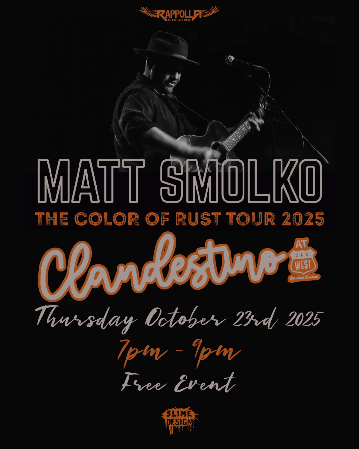𝗥𝗮𝗽𝗽𝗼𝗹𝗹𝗮 𝗘𝗻𝘁𝗲𝗿𝘁𝗮𝗶𝗻𝗺𝗲𝗻𝘁 𝗣𝗿𝗲𝘀𝗲𝗻𝘁𝘀 𝘛𝘩𝘦 𝘊𝘰𝘭𝘰𝘳 𝘖𝘧 𝘙𝘶𝘴𝘵 𝘛𝘰𝘶𝘳 𝗠𝗮𝘁𝘁 𝗦𝗺𝗼𝗹𝗸𝗼 is a singer/songwriter from Western PA playing blue collar Americana/Country. He brings a passionate, full speed ahead approach to his work and a live show you won't forget. 𝑳𝒊𝒔𝒕𝒆𝒏 𝑯𝒆𝒓𝒆 𝑭𝒐𝒓 𝑴𝒐𝒓𝒆 https://open.spotify.com/track/2aRyltNvDyvtcRiUGZyur1 This event is free and open to all that are 21+ 𝗙𝘂𝗿𝘁𝗵𝗲𝗿 𝗗𝗲𝘁𝗮𝗶𝗹𝘀 𝗔𝗯𝗼𝘂𝘁 𝗧𝗵𝗲 𝗖𝗹𝗮𝗻𝗱𝗲𝘀𝘁𝗶𝗻𝗼 𝗖𝗹𝗶𝗰𝗸 𝗧𝗵𝗲 𝗟𝗶𝗻𝗸 𝗕𝗲𝗹𝗼𝘄 https://zenwest-baltimore.com/